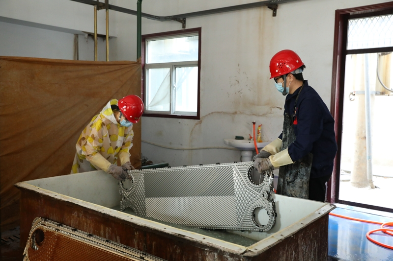 在交警支隊站,馬福森查看了板換清洗工作,并向二公司負責人了解設備維保、收費經營等情況,他對二公司打破崗位職責約束,對中層管理人員合理分工安排,對運行管理員、用戶管理員統(tǒng)籌調配,全力推進設備維保的做法予以肯定。他叮囑分公司工作人員,在分配工作任務時要本著人性化的原則,把時間調整開,盡量避開高溫時段。馬福森現場要求后勤負責人為一線員工購置電風扇,為室內板換清洗、閥門保養(yǎng)等工作創(chuàng)造相對舒適的工作環(huán)境;并要求總工程師辦公室及相關責任部門要盡快推進生產服務綜合體項目,爭取早日投產達效,應用先進的清洗設備開展板換清洗工作,降低員工工作強度。