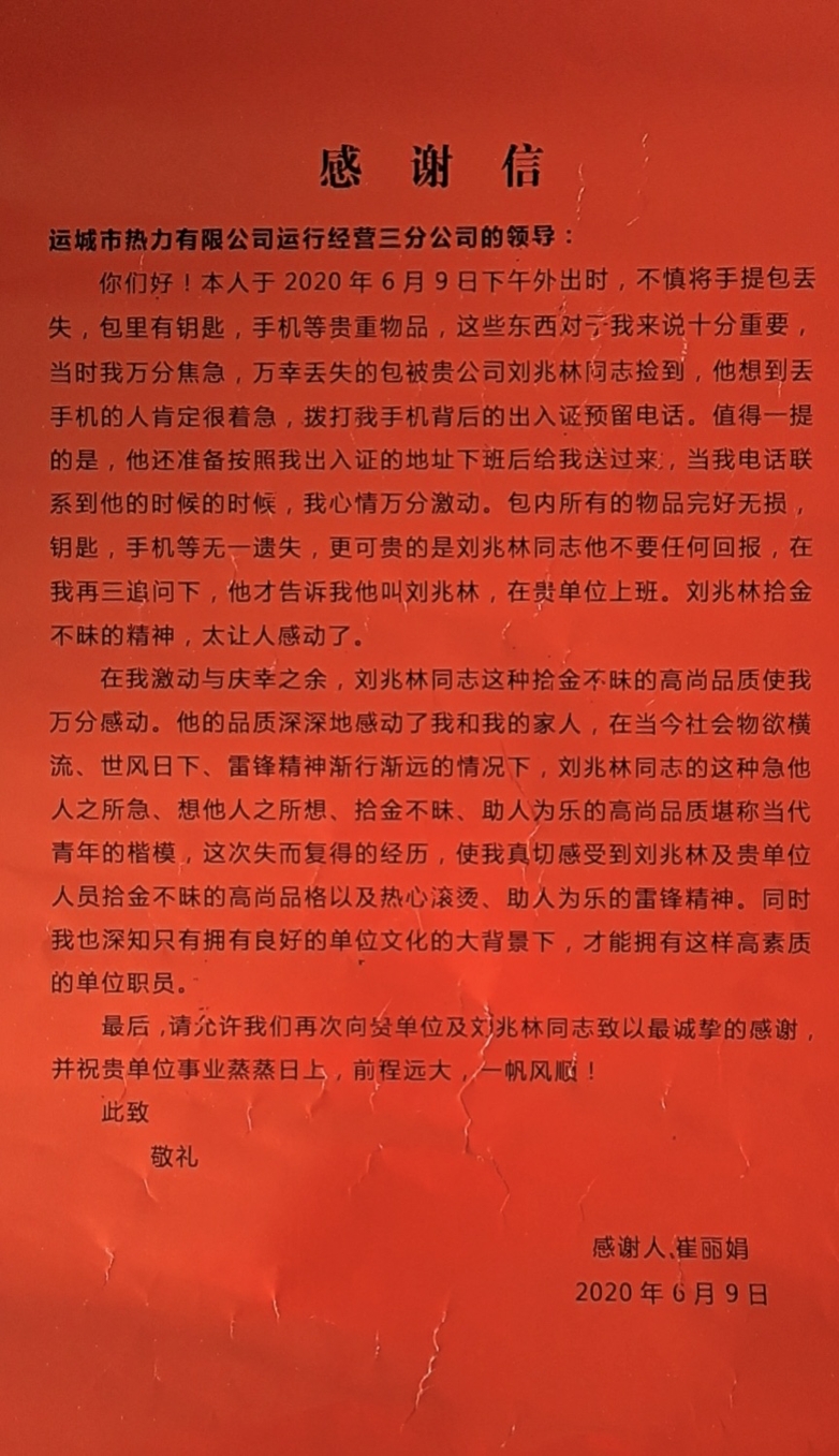 劉兆林同志拾金不昧,急失主所急,用自己的實(shí)際行動(dòng)踐行了運(yùn)城熱力人的精神風(fēng)貌,用良好的個(gè)人形象樹(shù)立了熱力人傳遞社會(huì)正能量的好榜樣,發(fā)揚(yáng)了中華民族的傳統(tǒng)美德,傳承了社會(huì)文明新風(fēng)尚。