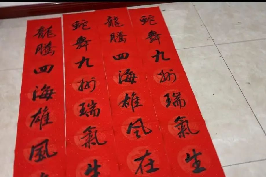 活動(dòng)現(xiàn)場(chǎng)氣氛火熱,墨香撲鼻,五張方桌“L”形排開(kāi),書法家們揮毫運(yùn)墨,隨著他們筆鋒的轉(zhuǎn)動(dòng),一副副對(duì)聯(lián)、“福”字寓意吉祥的春聯(lián)躍然紙上,書寫出辭舊迎新的美好前景。“龍騰已是清新地;蛇舞又將明媚天。紫燕歸巢春有約;金蛇賀歲福無(wú)邊。賀歲當(dāng)邀新燕舞;點(diǎn)睛試看小龍飛。銀蛇起舞開(kāi)春序;紫燕飛歌奏福音。蛇盤福字千家滿;蝶變春風(fēng)萬(wàn)里新。小龍接福呼春至;大夢(mèng)催人拓業(yè)忙。”